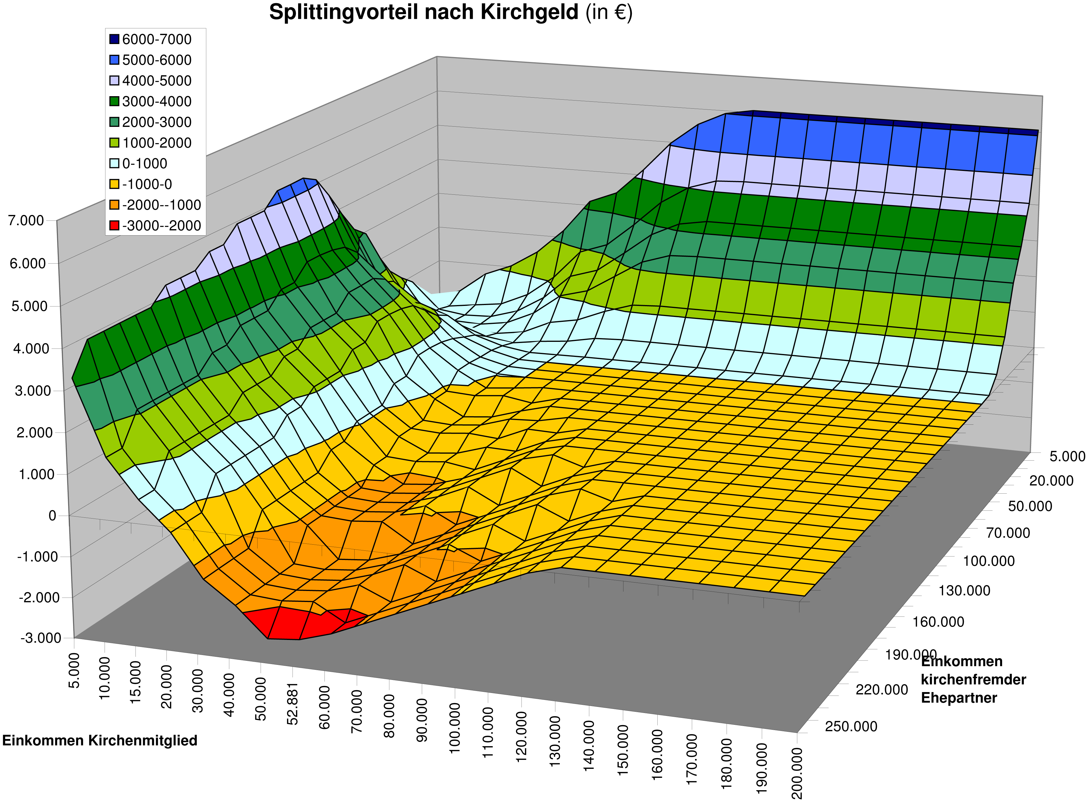 Bitte beachten, dass die Achse für das Einkommen des kirchenfremden Ehepartners hier aus Gründen der Darstellung von hohem zu niedrigem Einkommen verläuft, i.Ggs. zur Grafik für die Mehrzahlung weiter unten.